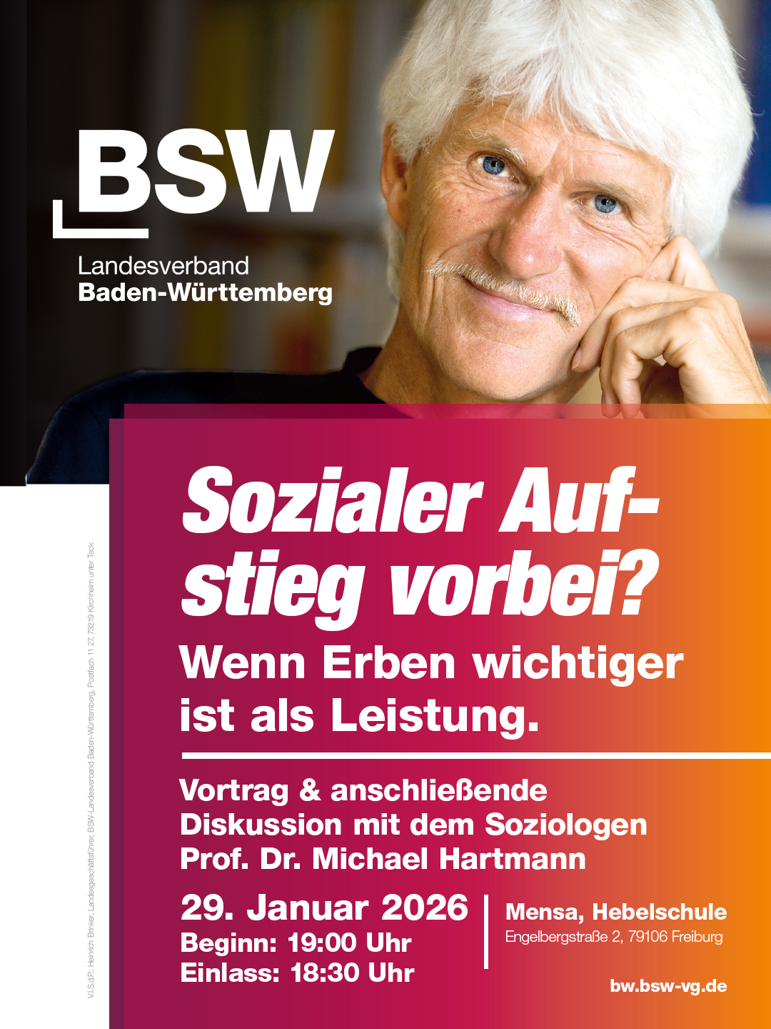 Zu diesen Fragen lädt der Landesverband BSW Baden-Württemberg zu einem Vortrag mit dem renommierten Soziologen Prof. Dr. Michael Hartmann ein. Er beleuchtet diese Entwicklungen nicht nur mit Blick auf Eliten, sondern vor allem im Hinblick auf die gesamte Bevölkerung. Im Anschluss besteht Raum für eine gemeinsame Diskussion.