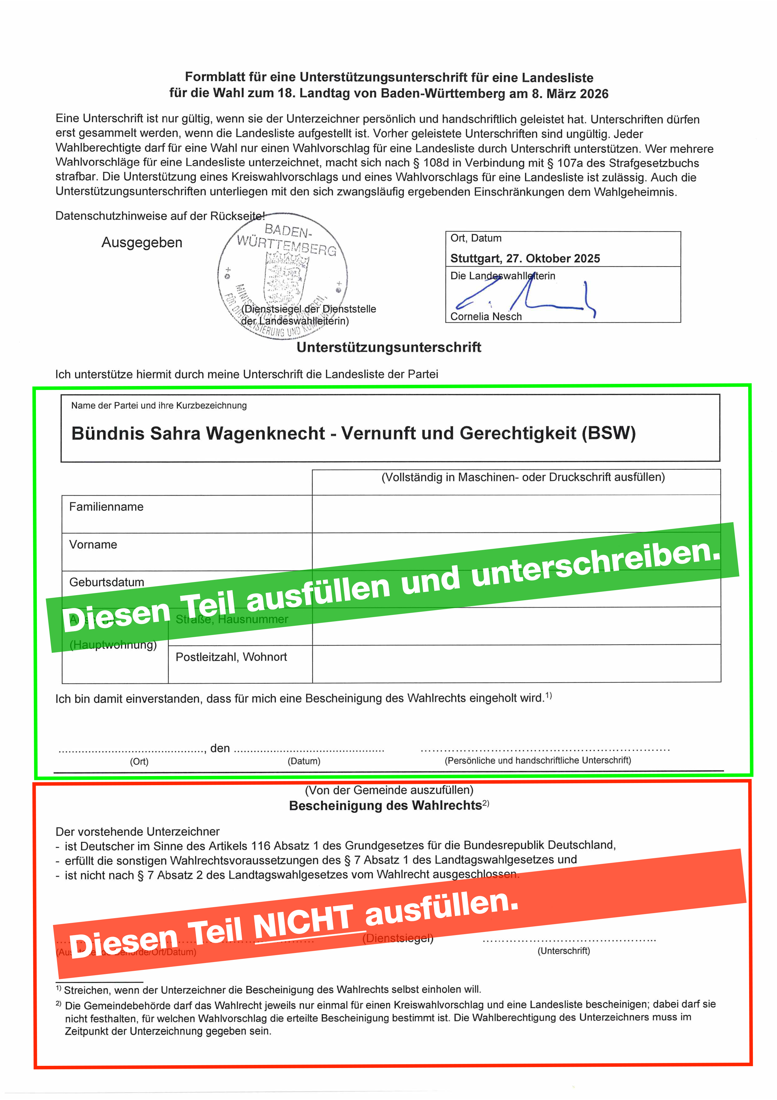 Unten finden Sie das Formular für die Unterstützungsunterschrift zur Landesliste des BSW Baden-Württemberg.